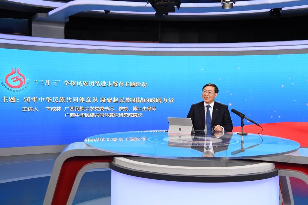 春风送暖,百花争艳。3月26日是农历三月初三。自治区教育厅根据疫情防控形势,决定2020年“三月三”学校民族团结进步教育主题活动实行线上课程教学,由广西民族大学党委书记、广西中华民族共同体意识研究院院长卞成林教授主讲的“铸牢中华民族共同体意识,凝聚起民族团结的磅礴力量”于当天10:20通过网络播送,截至27日上午 10时该线上课程的点击量已达134.5万。